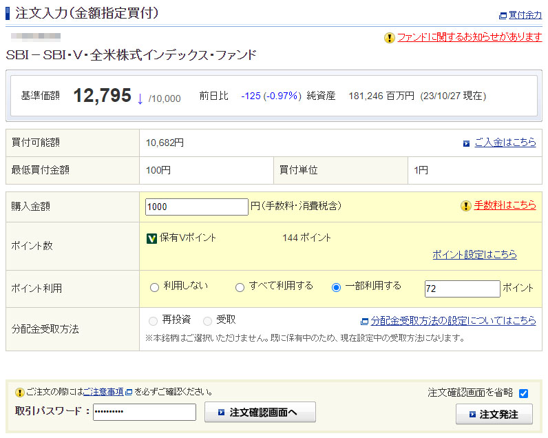 何れにしてもVポイントが入ったのでルーチンで1,000円分を入れます。半分の72ポイント分を利用して、口座からの持ち出しは928円。