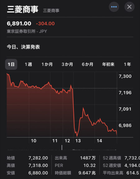 三菱商事(8058)が株式分割 今日、決算のあった三菱商事から株式分割のアナウンスがありました。 3分割のようです。現在7,000円ぐらいなので2,300円ぐらいで買えるようになるようです。 単元未満で買っている私には朗報! 今日株価は大きく下げました。 いままでNTTとJR東海の株式分割を見てきましたが両方とも分割後は低調な動きにまりました。三菱商事はどんな動きをするのか楽しみです。来年からという事なので分割直後は新NISAで買い相場かも?私も来年には1株w 買おうと思っていましたが3株買えますねwww