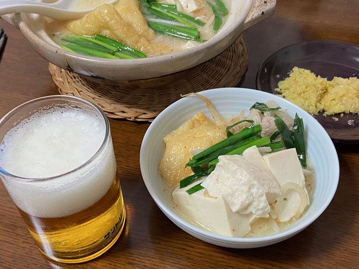 加えた具材は、油揚げ、ニラ、ネギ、モヤシ、豆腐と安いヤサイがメインです!