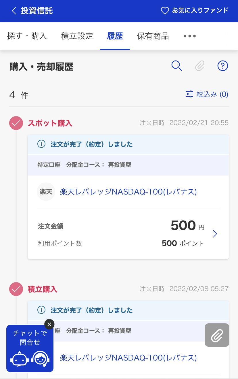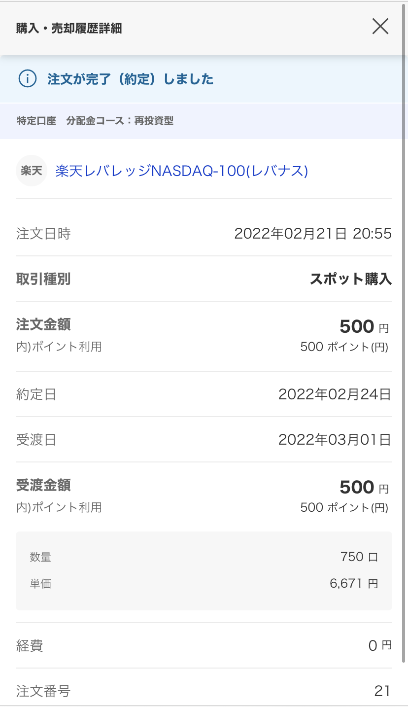 楽天レバレッジNASDAQ-100 スポット購入が約定しました