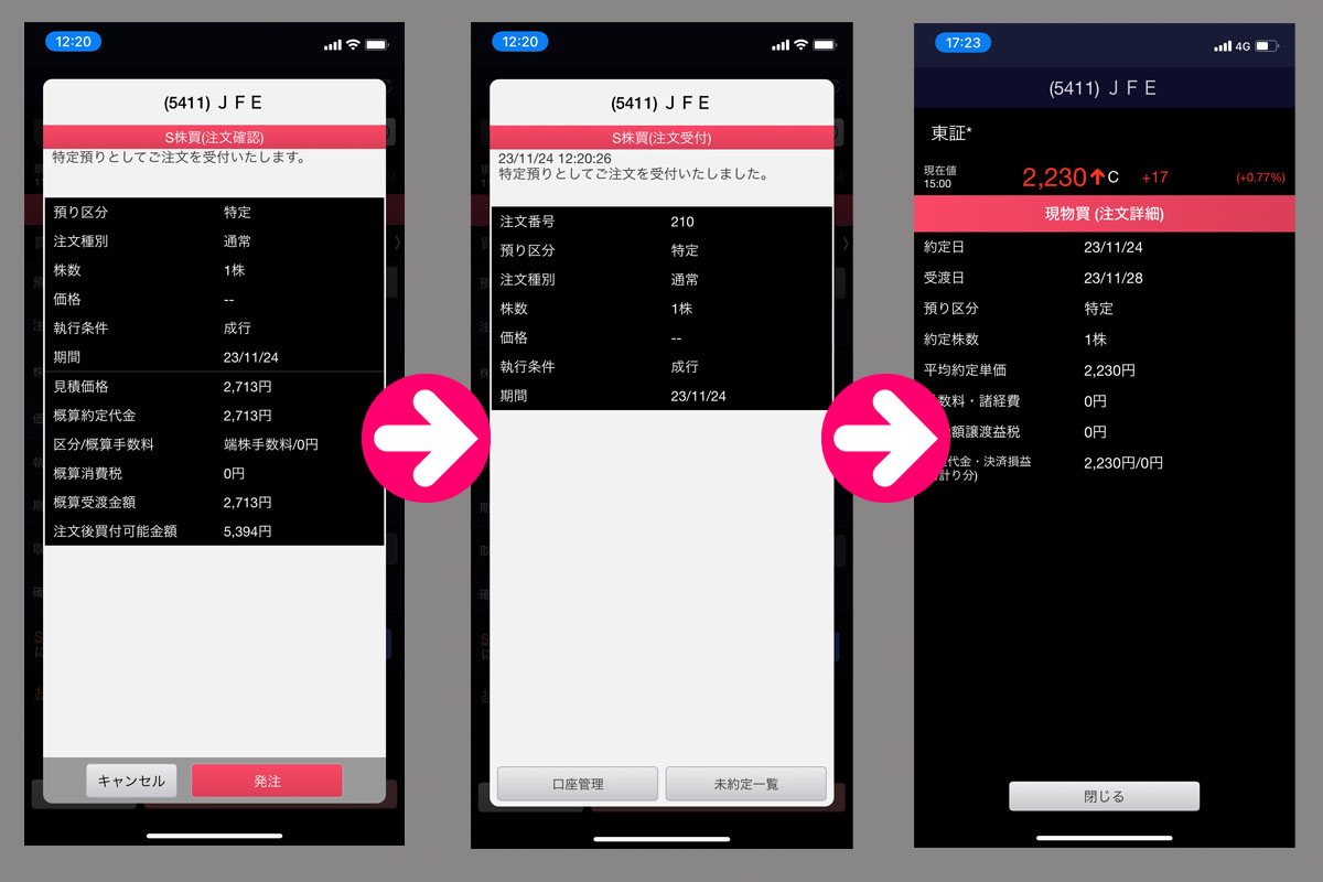 今回も少し慎重に!やはり12:30前までに注文完了なので後場引けの株価で約定になります。