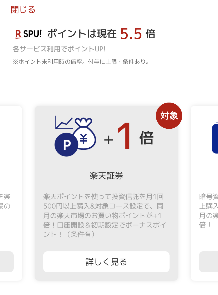 3月になりSPUが落ちました 予定通り。。。 楽天証券分のSPU+1倍が無くなりました。トホホ ・・・と思ったら2日に復活! そうそう!確か3月いっぱいはSPUが効くんだったけ なんで昨日だけ落ちたのかな???