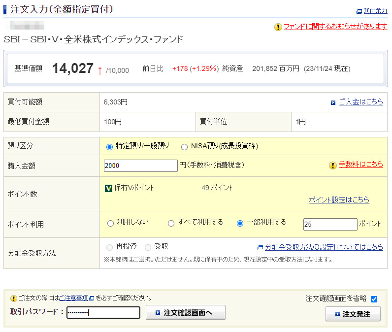 「SBI・V・全米株式インデックスファンド」にはポイントは約半分使って49ポイントを使用。