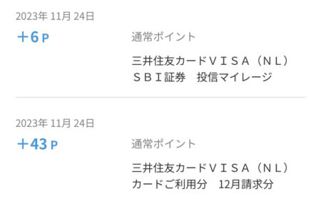 今回は毎月入る「投信マイレージ」と「三井住友カードVISA(NL)カード利用分」です。カードの方は12月請求分なので11月利用分です。ん~~~マイレージは先月と同じ6ポイント。。。