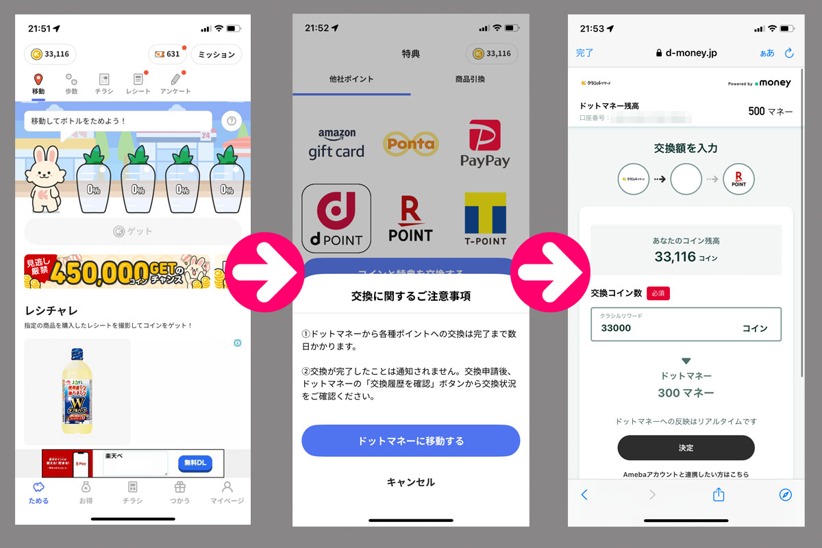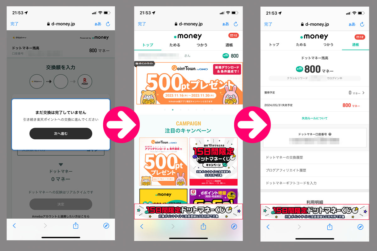 クラシルリワードのコインが貯まったのでドットマネーに変換|2023.11.26 もう少しでコインが33,000になりそうだったので おみくじ10回引きw を繰り替えして・・・。 強引に貯めました。コインをドットマネーに変換します!(詳しい方法はこちら) 300マネーが追加され800マネーになりました。 次に33,000コインを貯めて変換すれば1,100マネーになりますので換金できるようになります。