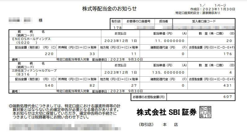 ENEOSホールディングス(5020)の配当が入りました|2023.12月 単元未満で50株保有のENEOSホールディングスから配当金が入りました。 ですが権利日にはまだ20株しかなかったようで・・・ 11円×20=220円。税引後176円です。少額でスミマセンw ENEOSも原油高を背景に株価が高騰していてイマイチ買い増しする機運が・・・笑