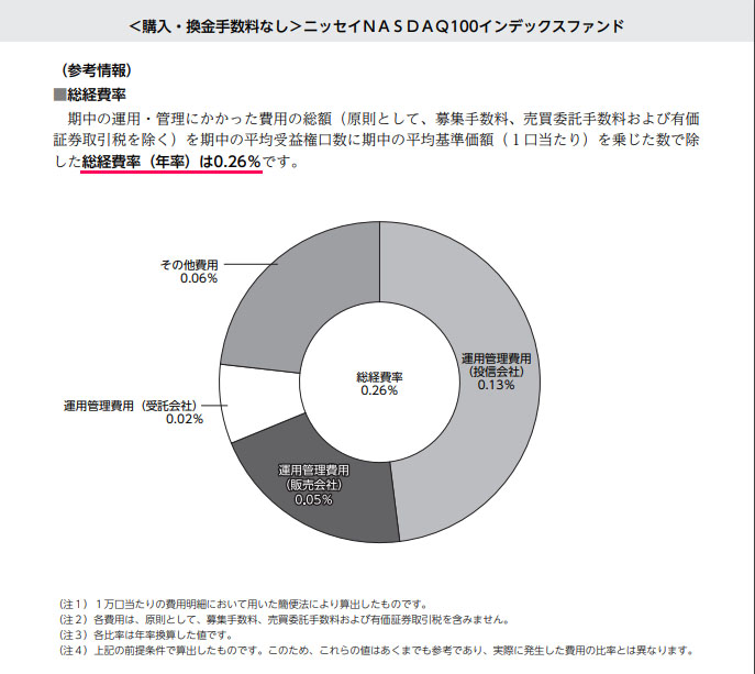 「ニッセイNASDAQ100インデックスファンド」の隠れコストを含む信託報酬 しばらく前にSBI証券経由でファンド状況の案内が来ていたので資料を見ると 1年が経過したので隠れコストも出てきました。 0.20035%とありましたが隠れコストが0.06%あり 総経費率は0.26%。まぁそれでもNASDAQ100のインデックスでは最安!