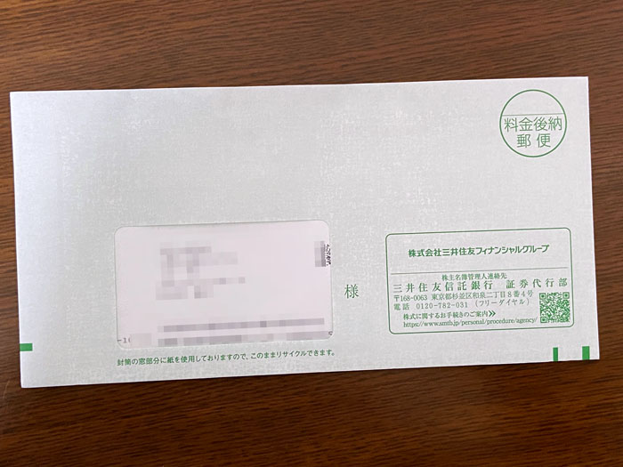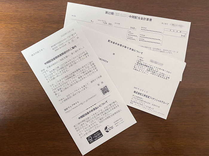 三井住友フィナンシャルグループ(8316)から中間配当金関係書類が届きました。 単元未満で4株保有の「三井住友フィナンシャルグループ」から中間配当金関係書類が届きました。 おなじみの洋0封筒(長3)の封書。 中身は「第22期中間配当金計算書」と「配当金のお受け取り方法について」そしてご案内状の3枚。パンフレット的なカラー印刷物はありません。 多分、単元株主にはあるのでしょうねw 三井住友フィナンシャルグループを単元まで買うのはまだまだ長い道のりです。
