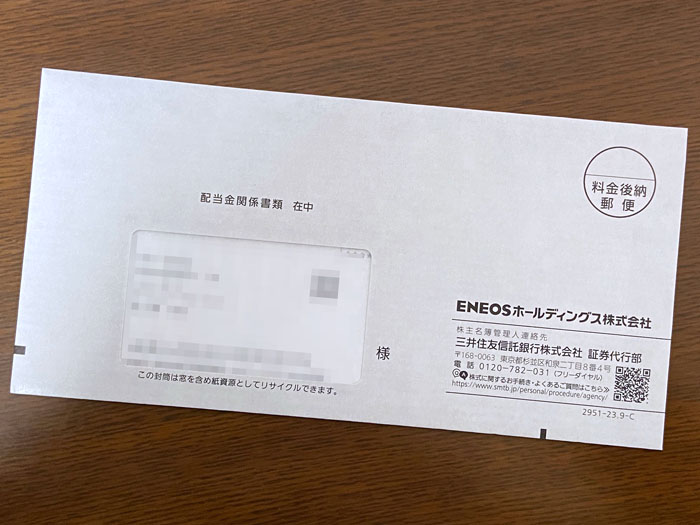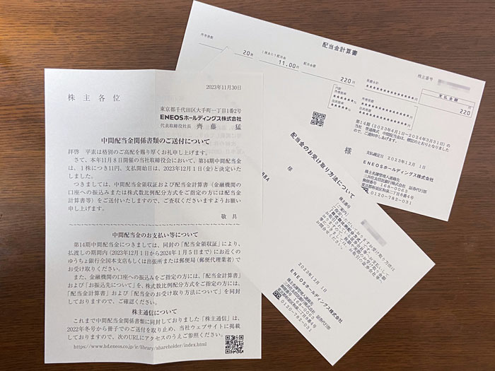 ENEOSホールディングス(5020)から配当金関係書類が届きました。 こちらは単元未満で50株保有のENEOSホールディングスから届いた「配当金関係書類」です。 こちらも洋長3封筒の封書。 まだ20株の時に権利落日が来たようで今回は20株に対しての配当金です。 こちらも「配当金計算書」と「配当金のお受け取り方法について」「中間配当金関係書類のご送付について」の3枚の印刷物でパンフレット的なものはありませんでした。