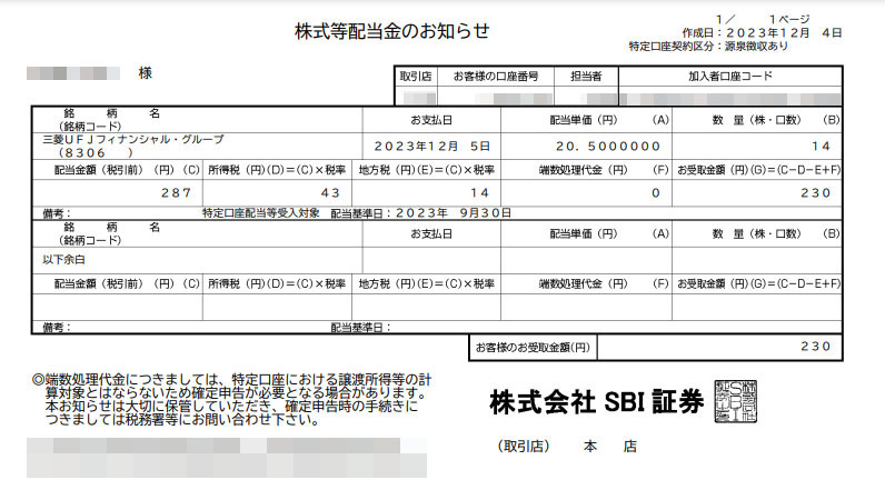 三菱UFJフィナンシャルグループ(8306)の配当が入りました|2023.12月 SBI証券で単元未満で買っている「三菱UFJフィナンシャルグループ」からも配当が入りました。 14株保有で配当は20.5円なので287円。税引後は230円です。 「三菱UFJフィナンシャルグループ」も株価が高騰してしまいなかなか先に進みません。年内単元化は不可能となりました。・・・が、せめて20株にはもっていきたい。けどもう1か月切ってしまった。。。