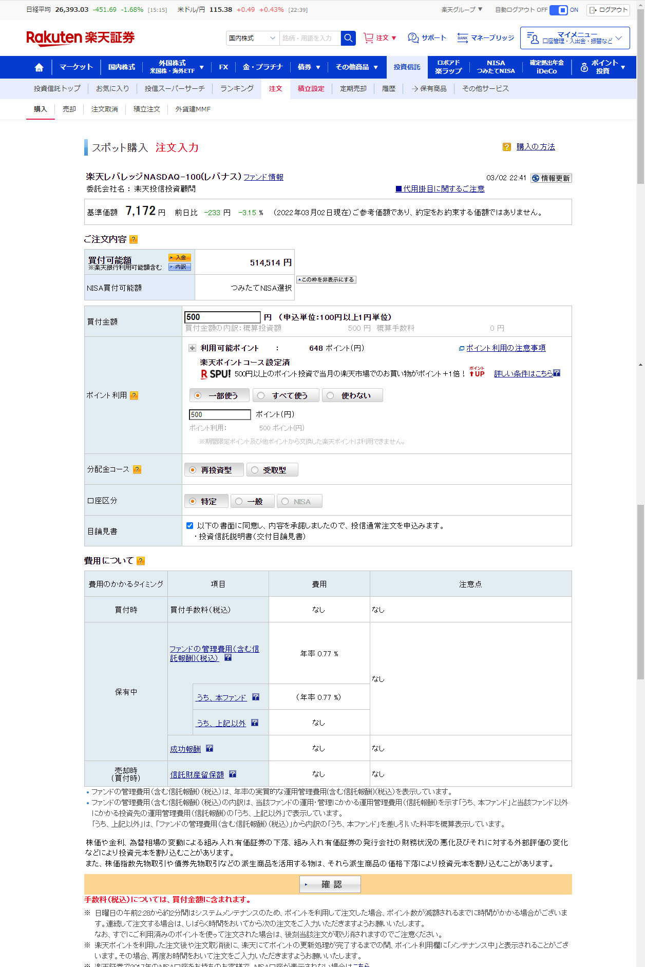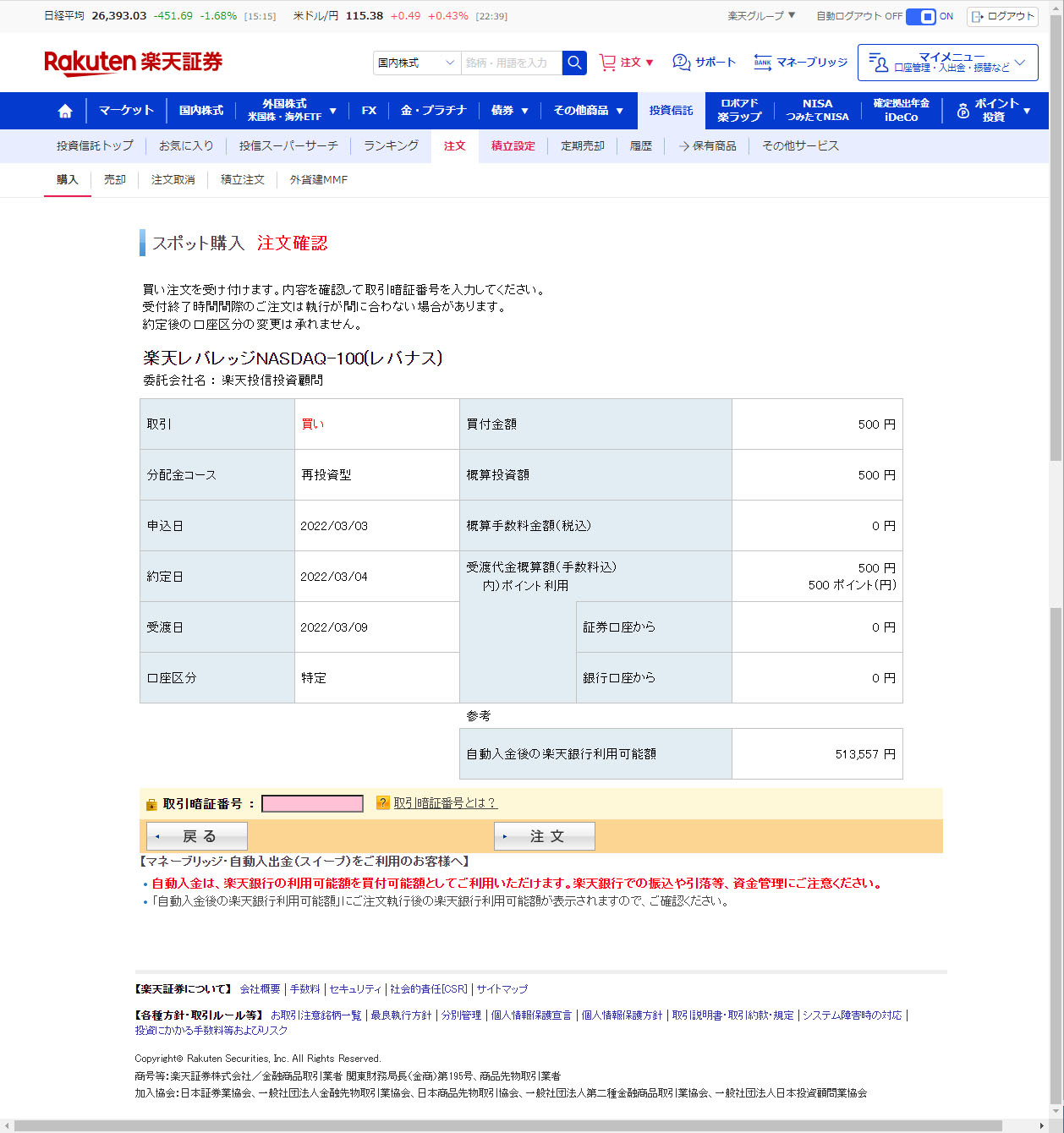 楽天レバレッジNASDAQ-100④スポット投資しました