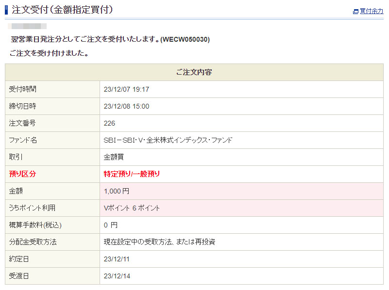 Vポイントが入ったのでSBI・V・全米株式インデックスファンドを1,000円分追加|2023.12.7 毎月は入らない「三井住友カードVISA(NL)VポイントUPプログラム特典/クレジット」のポイントが今月は入りました。無意識のうちに何かにエントリーしてるんでしょうか??? 12ポイントと少ないですが嬉しい。実際なんのポイントなのか?分かっていません。 まぁ~何時ものようにですw 「SBI・V・全米株式インデックスファンド」に1,000円分 6ポイント利用して口座からの持ち出しは994円になります。 今年もあと僅か。SBI・V・全米株式インデックスファンドのVポイント投資もあと数回になります。何とかやり遂げられそう!