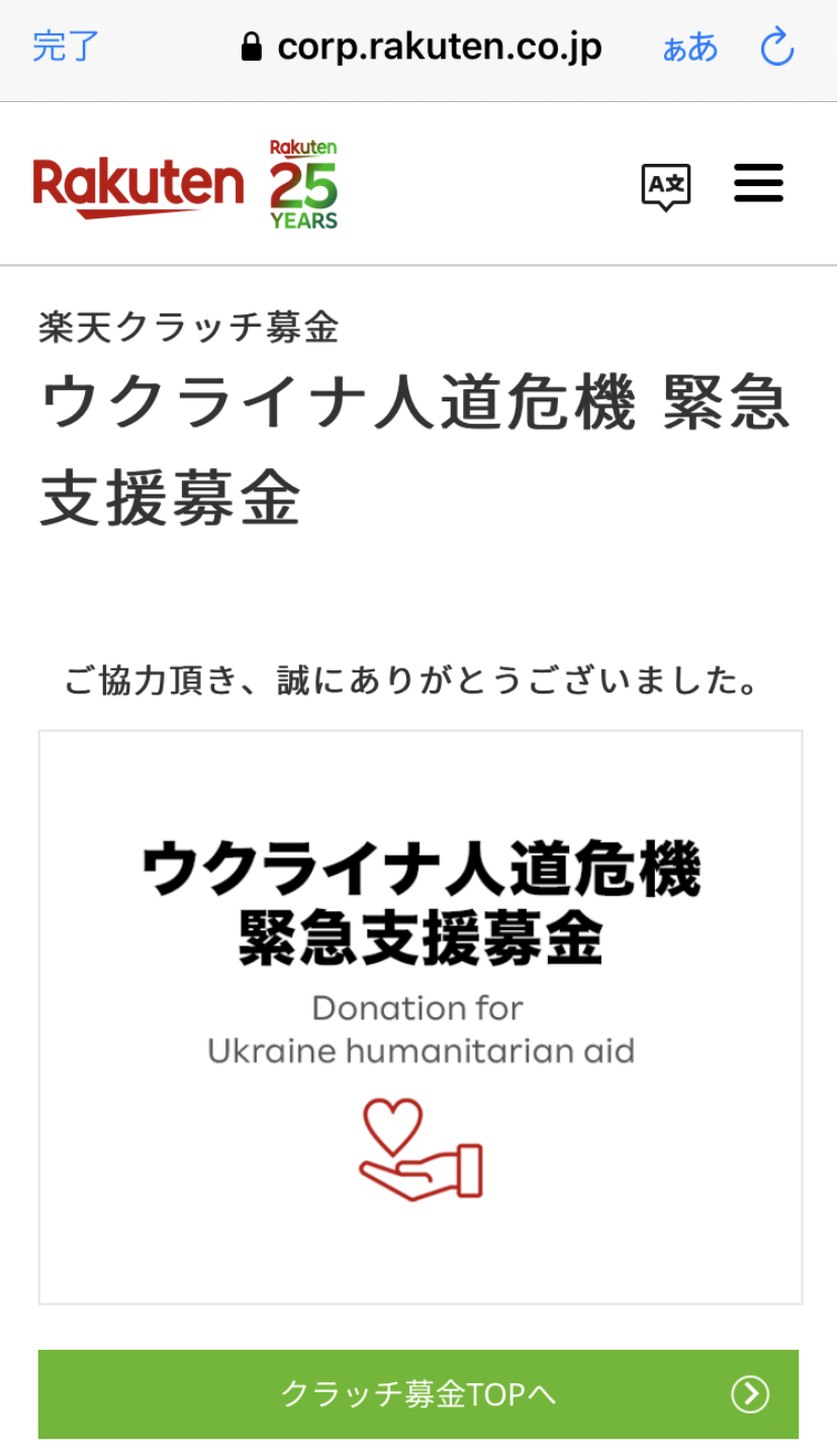 楽天で「ウクライナ人道危機 緊急支援募金」のクラッチ募金をしました。