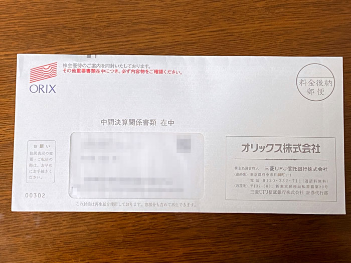 昨日配当が入ったオリックスから封書が来ました。