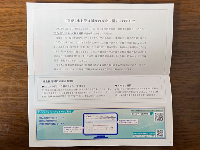 ・・・ですがカタログギフトを含めこの「優待カード」も2024年3月をもって廃止だそうです。