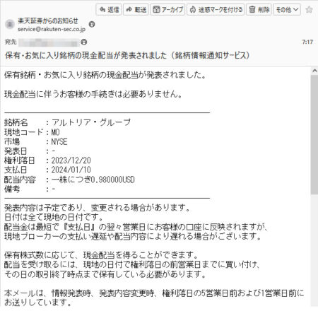 アルトリア・グループ(MO)配当予告 2024.1 楽天証券からアルトリア・グループの配当の案内メールが届きました。 先日、2株買ってそれっきりですが初めての配当になります。 $0.98×2株=$1.96 $1.96×0.9=$1.764 $1.764×0.79685=$1.4056434 の予定w