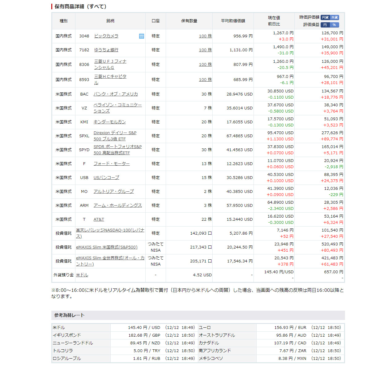 為替を無視するとSPYDとフォードが含み損ですがSPYDはSPXLと逆位相な関係なので仕方ありません。去年は逆でした。フォードも底値付近をウロウロしてると思っているので何れ上がると信じています。楽天証券の単元で保有してる日本株はおおむね好調!税金とられるのが惜しい。。。