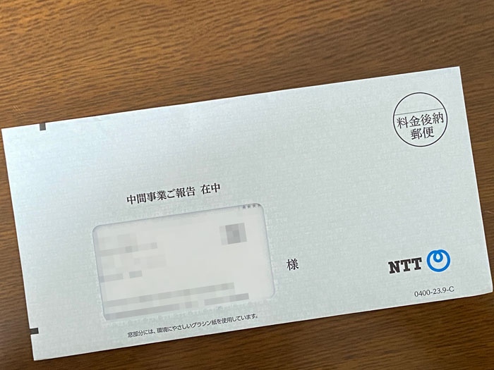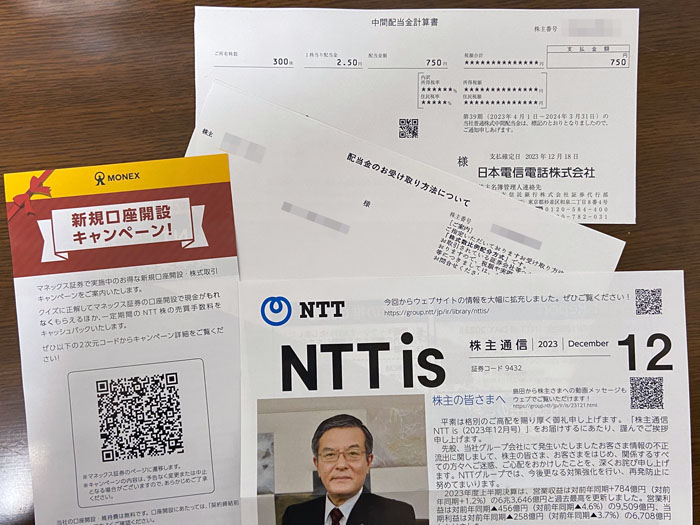 日本電信電話(9432)から中間事業ご報告が届きました。 そろそろ来るかな?と思っていたらポストに入っていました。配当金と同日でした。 一瞬請求書かな?と思うような封筒www やはり定型の洋0封筒です。 中身は「中間配当金計算書」「配当金のお受け取り方法について」「株主通信」とマネックス証券の新規口座開設キャンペーンのフライヤー。 まだ全然読んでませんwww また時間のある時にじっくりと・・・。