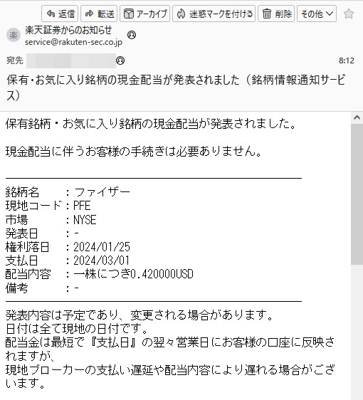 ファイザー(PFE)配当予告 2024.3 楽天証券から先日3株だけ購入したファイザーの配当のお知らせが来ました。 まだ年末なのに年明け3月の配当のお知らせですwww $0.42×3株=$1.26 $1.26×0.9=$1.134 $1.134×0.79685=$0.9036 大体これぐらいの予定www ファイザーは金曜日に小幅に反発して現在はちょっぴり含み益www ですがまだまだ下げトレンドでしょう!資金があったら買い増したいのですが・・・ないですw