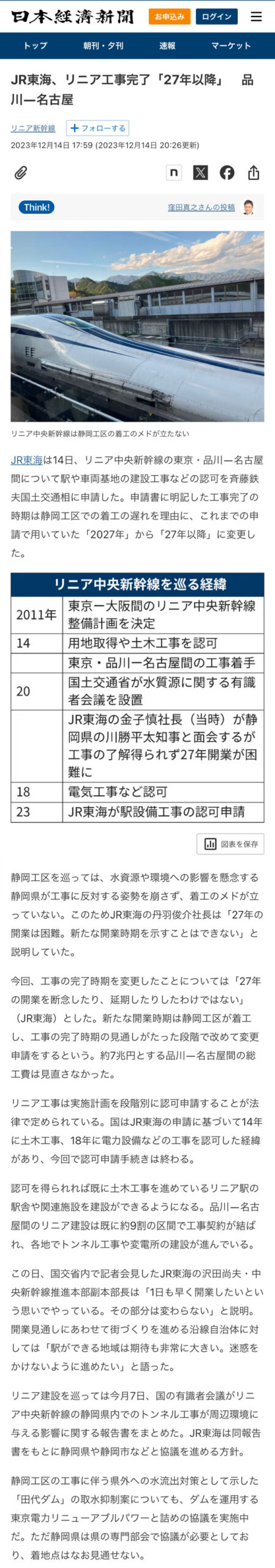 リニアのニュース|JR東海 静岡県内の工事で揉めてるリニアですが完成が遅れそうだというニュースが日経電子版にありました。 まぁ~最近は東京オリンピックだったり大阪万博だったりなかなか予定通りには進みませんね~ 正直あまり詳しく知らないのですが既成事実だろうと思うので何れは完成するでしょうw