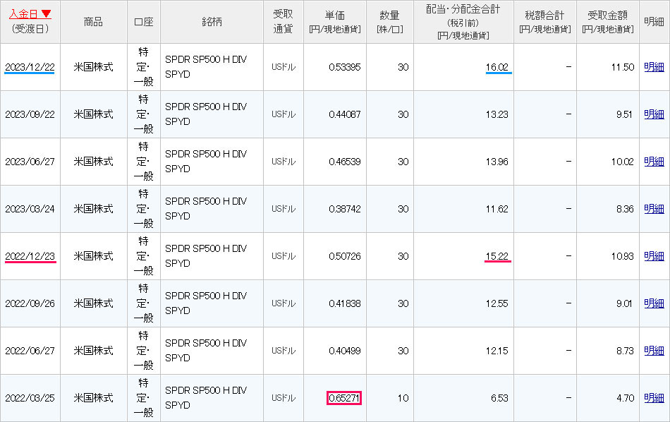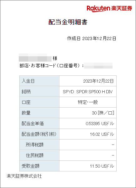 米国高配当ETFの「SPYD」から分配金が入りました。