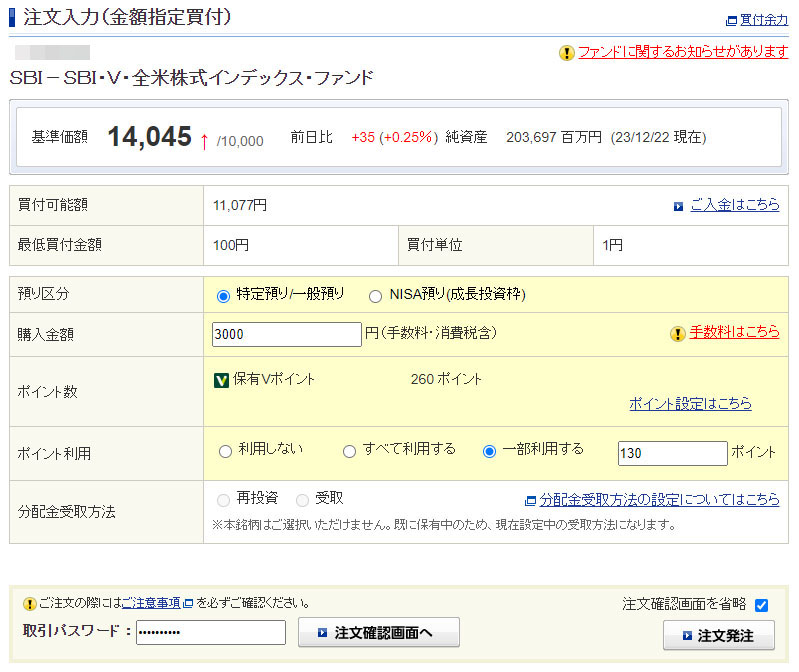 そして「SBI・V・全米株式インデックスファンド」に3,000円分