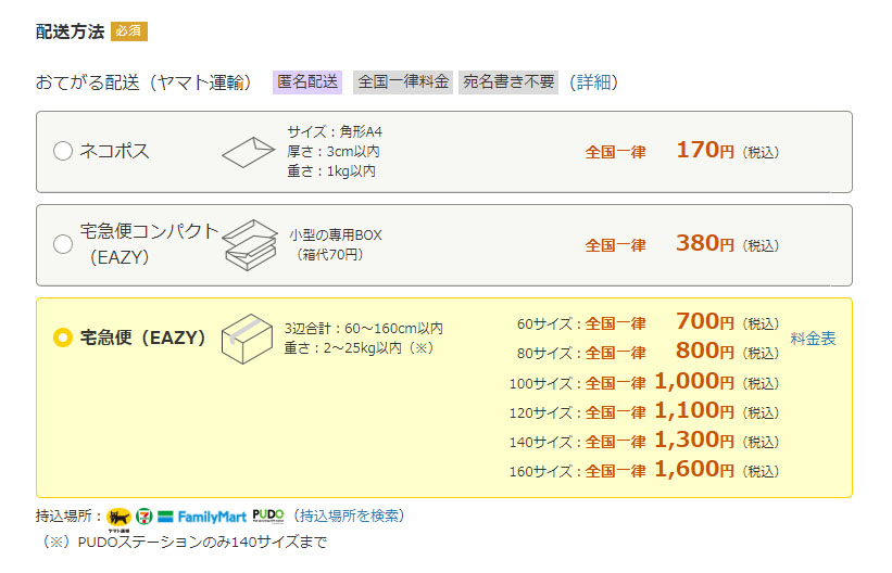 私が主に出品してる品はほとんどが80サイズなので宅急便(EAZY)になります。