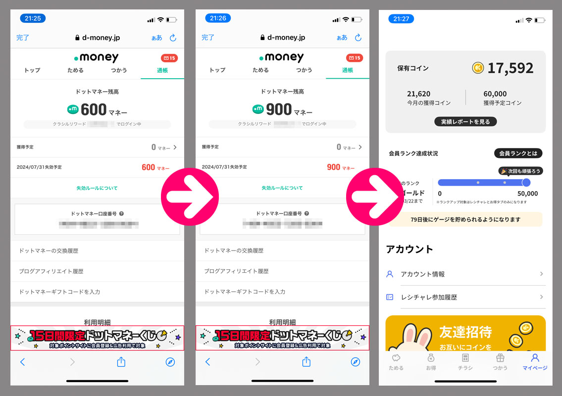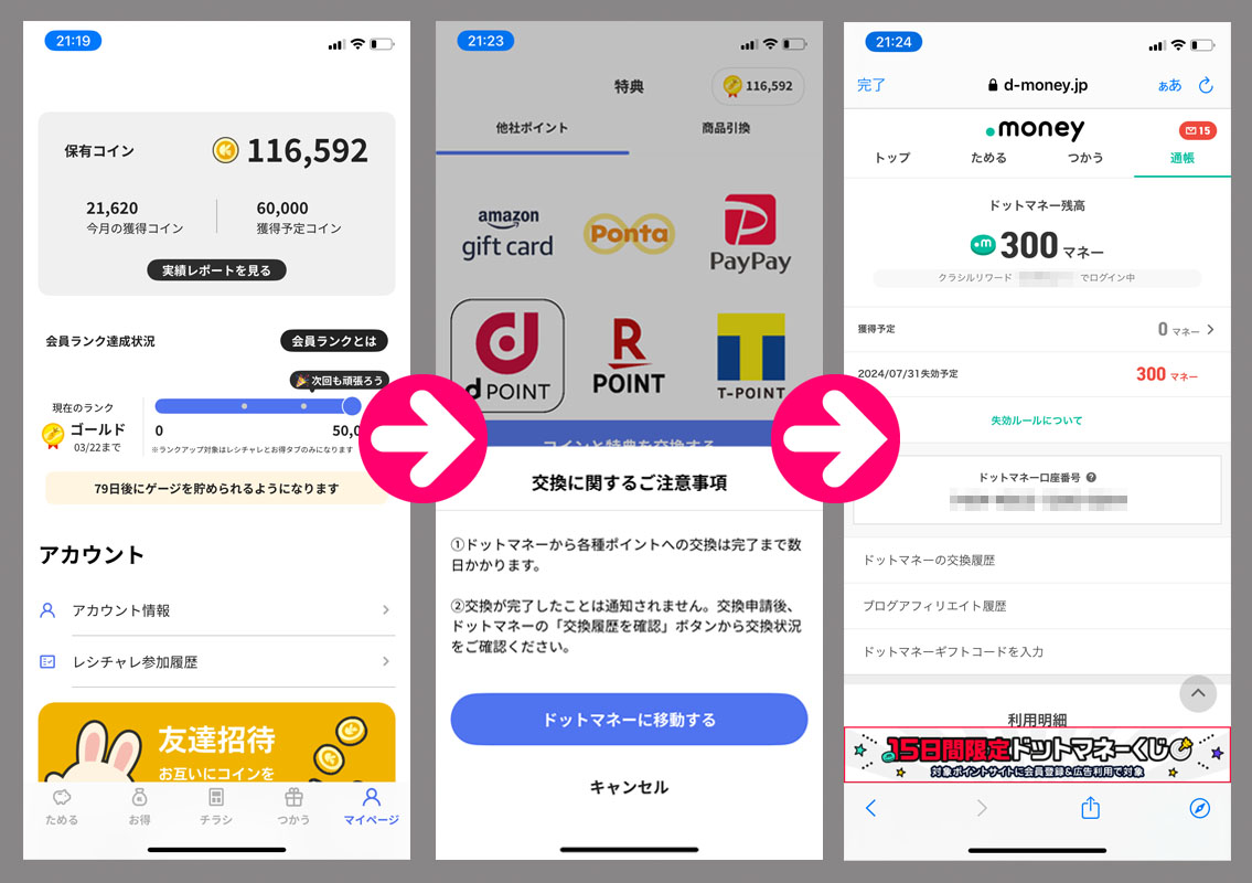 クラシルリワードのコインが貯まったのでドットマネーに変換|2024.1.3 レシチャレと年始の「おみくじ」がかなりコイン稼ぎになり、年末年始でクラシルリワードのコインが116,592枚となりましたのでドットマネーに変換しました。 1回の変換が33,000コインなので3回分です。(変換について詳しい方法はこちらをご覧ください) 3回で900マネーに!換金に必要な1,000マネーまであと1回。 残は17,592コインなのであと16,000コインぐらいです。 まだ年末に手続した分の換金がされていませんがこちらも追々と・・・。