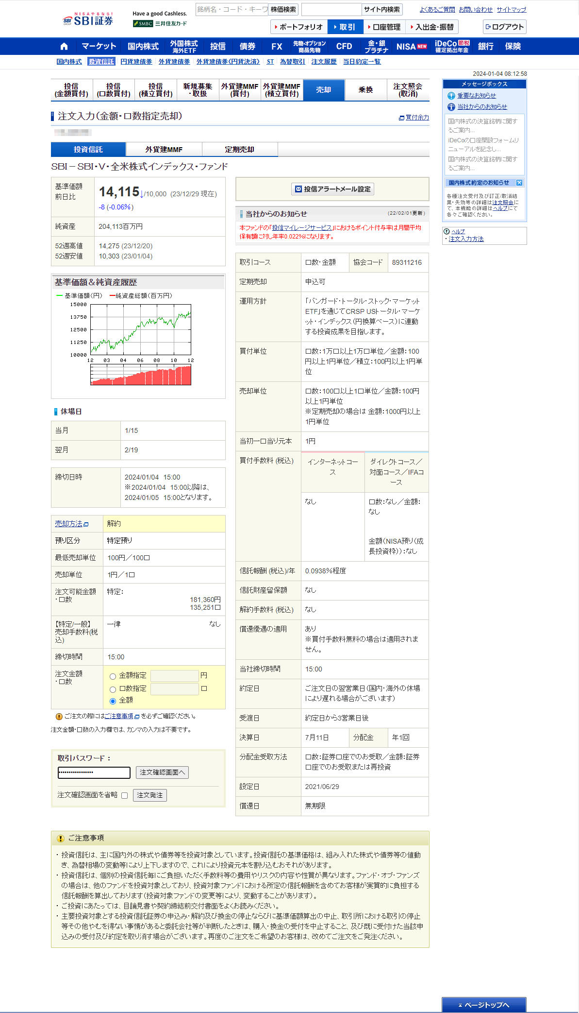 2022年8月からSBI証券の特定口座で積立とスポットで購入していた「SBI・V・全米株式インデックスファンド」を売ることにしました。
