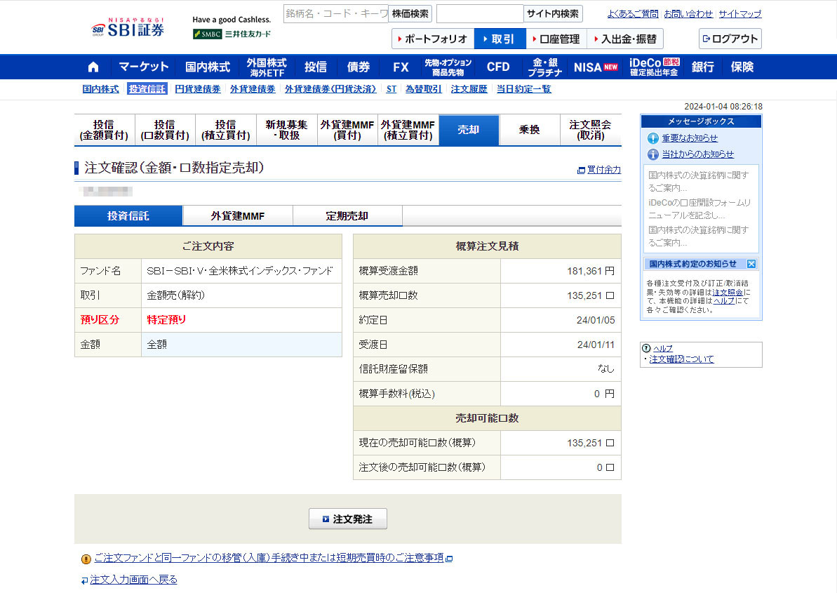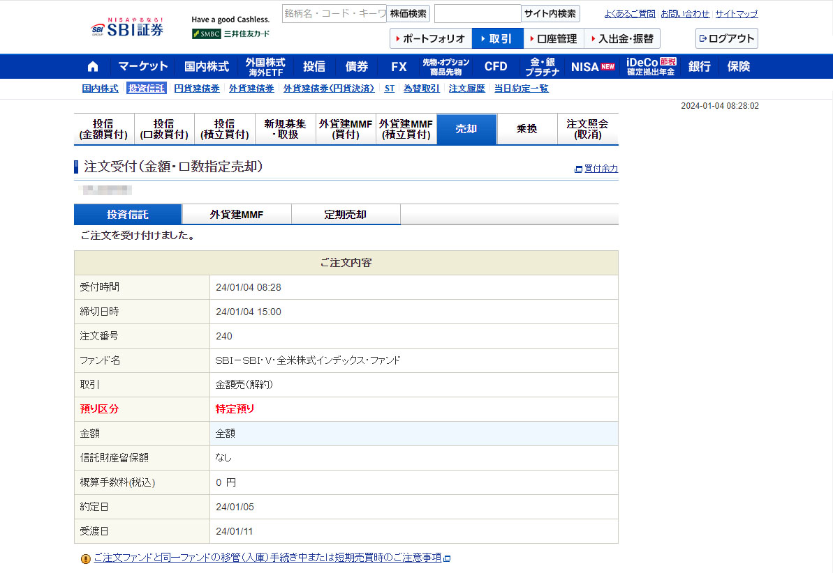 投信の売りは初めてです・・・が、特に不明な点もなく