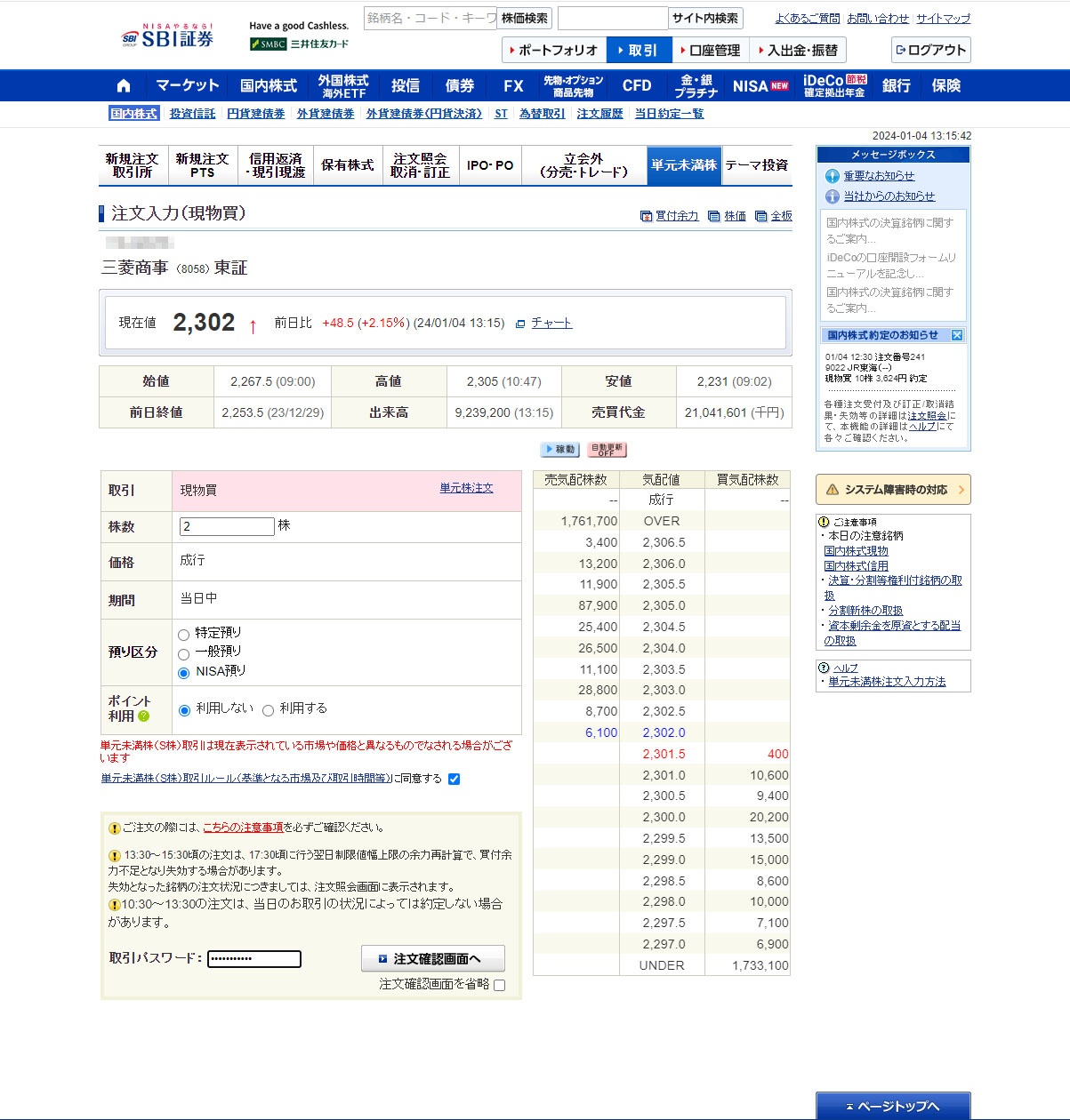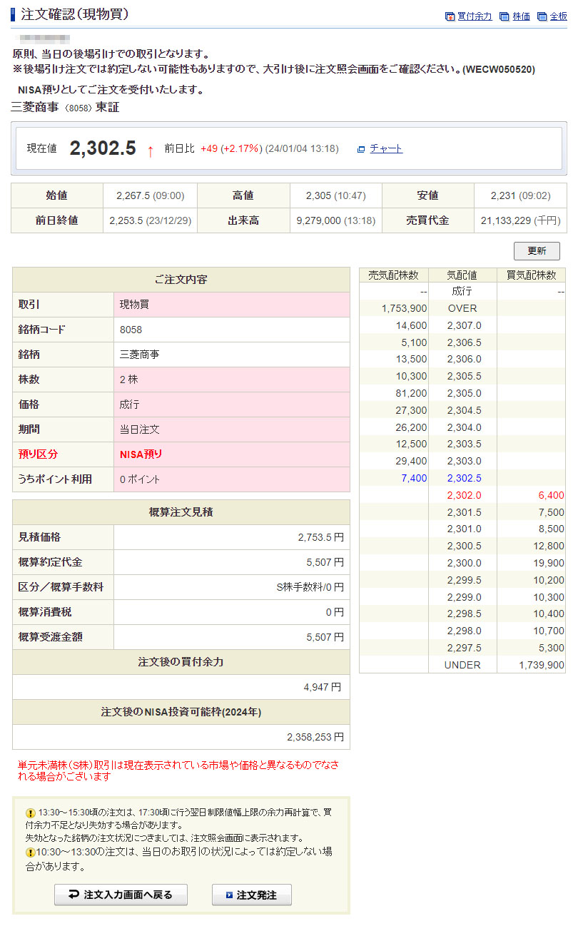 注文を入れる段階で2,302円。安くはないけど単元未満ならお手頃価格!3株買おうと思っていましたがJR東海が予想以上に高値だったので2株にしました。まぁ最初なので今日の買値を基準にして今後は考えていきます。