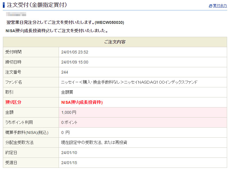 年末に「クラシルリワード」で貯めたコインを換金申請していたドットマネーが現金化されCYBERAGENTより楽天銀行口座に入金があったので「ニッセイNASDAQ100インデックスファンド」へ入れます。