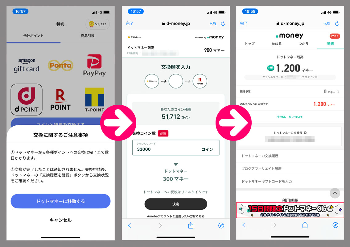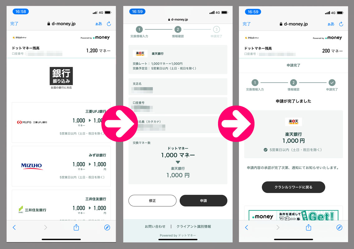 クラシルリワードで先日のレシチャレ『魅惑のハリッサ』分、20,000コインが入ったのでドットマネーに変換し1,000ドットマネーに達しましたのでそのまま換金の手続きへ・・・。