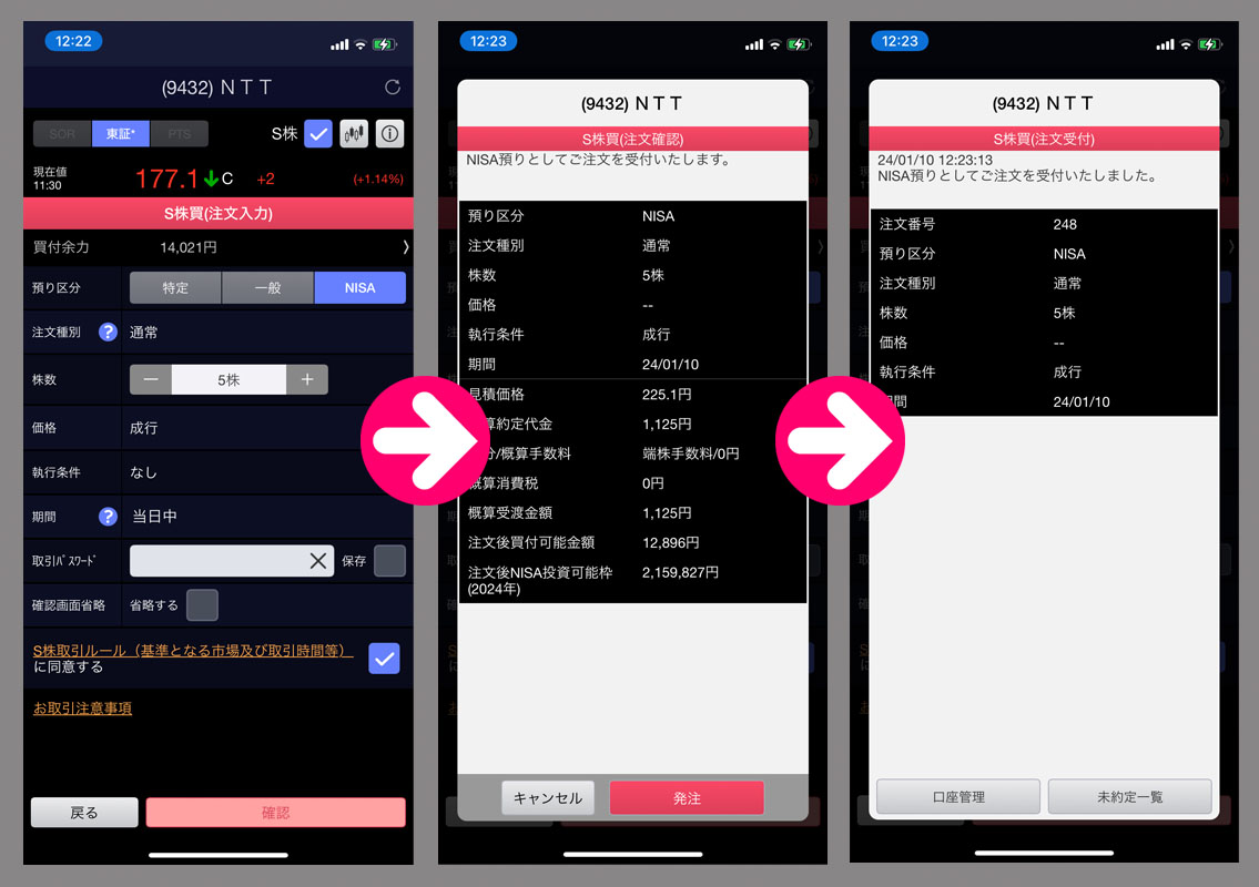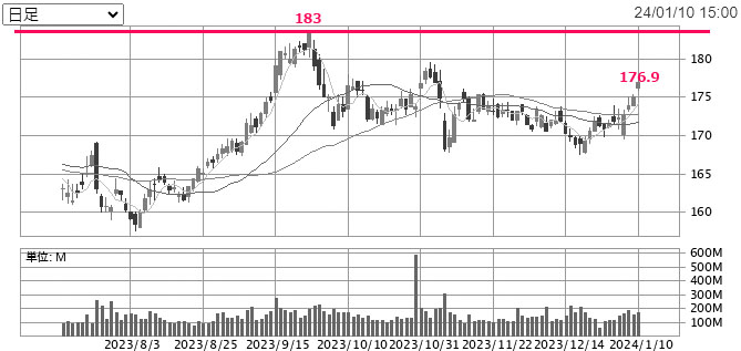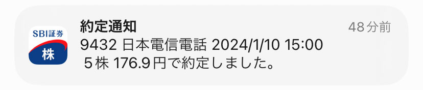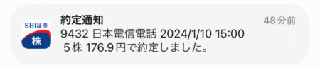 日本電信電話(9432)を5株追加|2024.1.10 今日も出勤しましたので昼休みに「日本電信電話」を5株追加購入! 今日も微妙に上がっていますが5株にしました。 やはり新NISAがはじまって買ってる人が多いのかな???株単価が安いので・・・そういう私もですがwww 今日もまだ12:22なので当日の後場引けの株価で約定になります。 176.9円での約定。ん~~~想定より高かった。。。 分割前の高値が183円なので底から半値戻しぐらいかな? 何となく上昇トレンドに入ってる感じ・・・明日は在宅なので買いませんがこのまま上がっていくと買い難くなるな~
