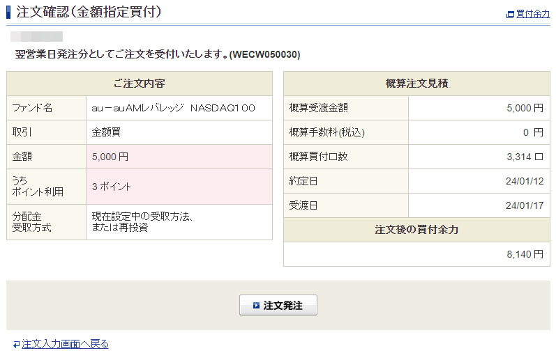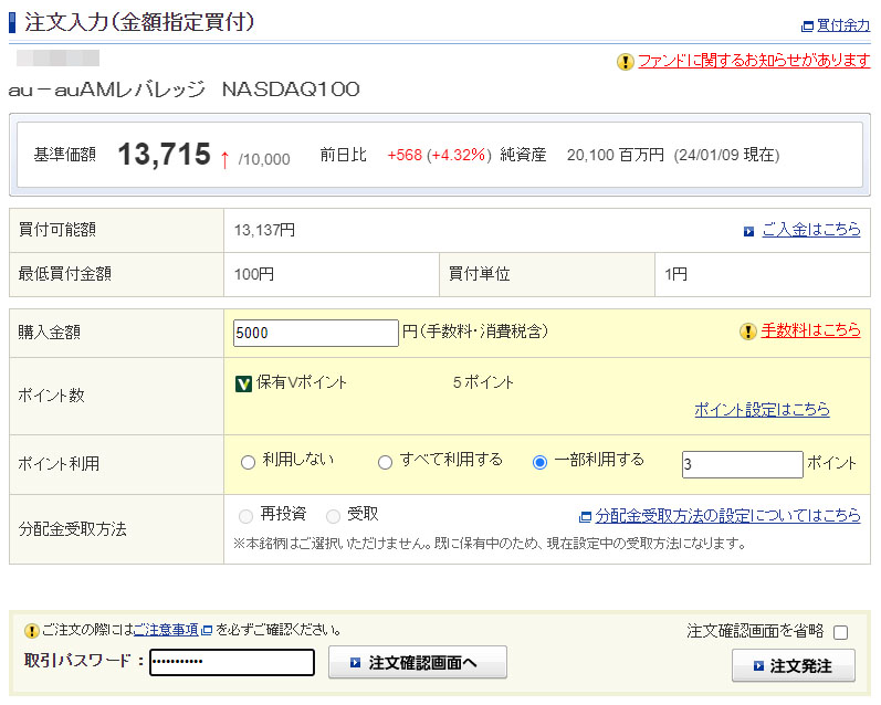 それで「auAMレバレッジNASDAQ100」は去年まで月々5,000円の積立の設定をしてたので月初の1回のみポイントを含め5,000円入れる事にしました。(*新NISAのつみたて投資枠でクレカ決済の50,000円枠を使い切っていて「auAMレバレッジNASDAQ100」には使えないからです)