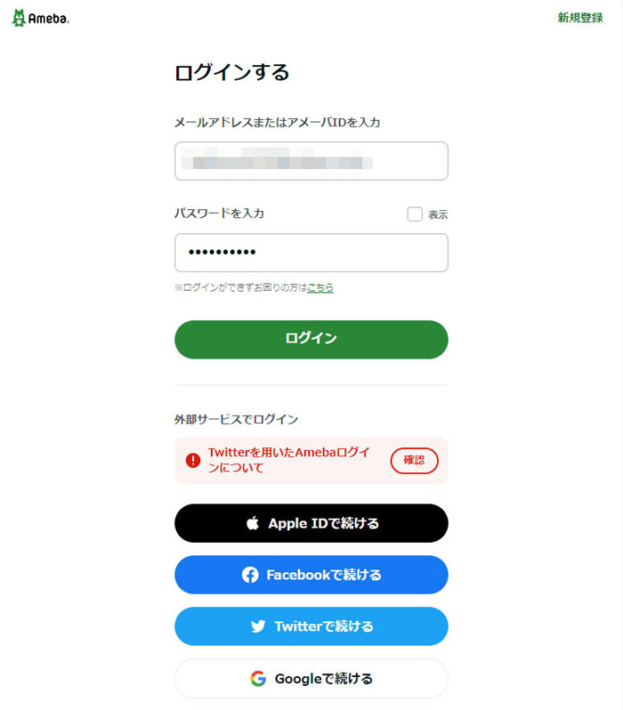 私は既にアメーバーにアカウントがありますのでログインですが、アカウントがまだない方は新規登録です。