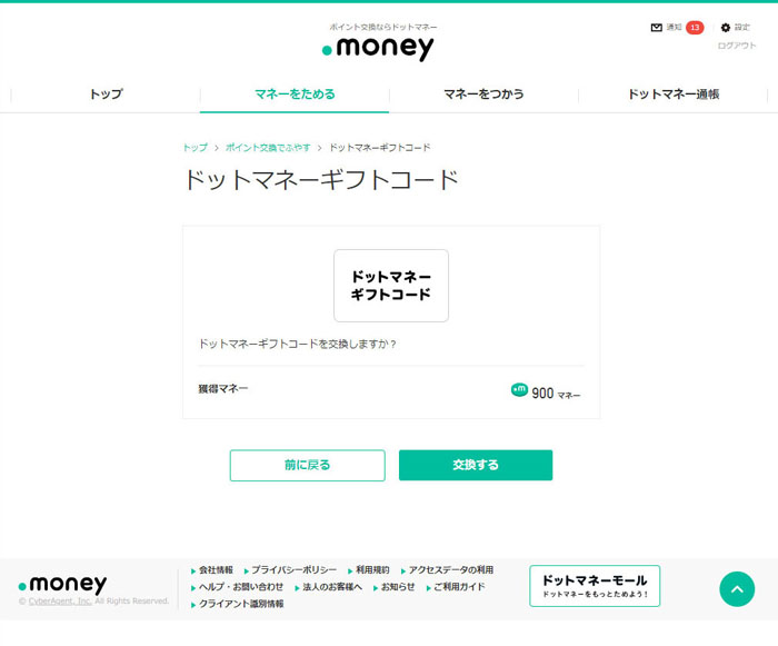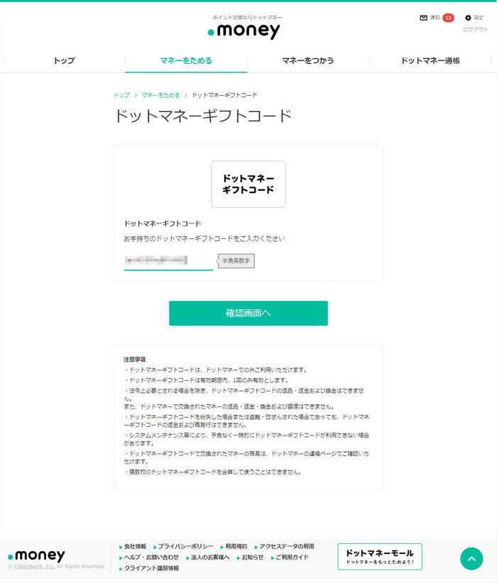 下までスクロールして「ドットマネーギフトコードを使う」をクリック。