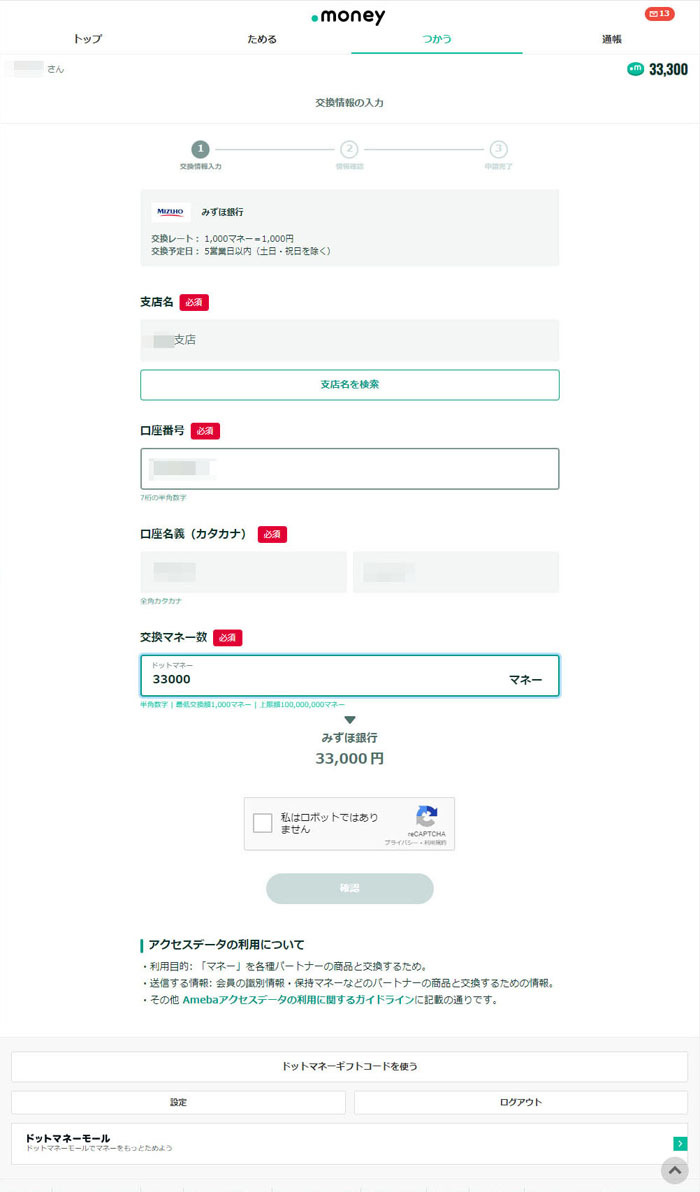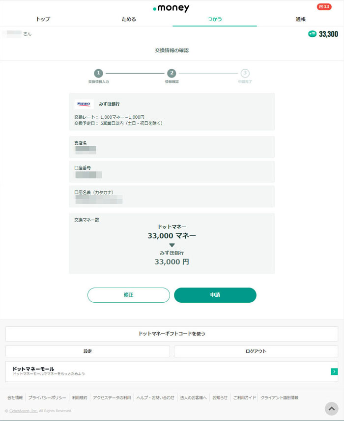「申請完了」! 端数は換金できませんでしたので300マネー残になりました。