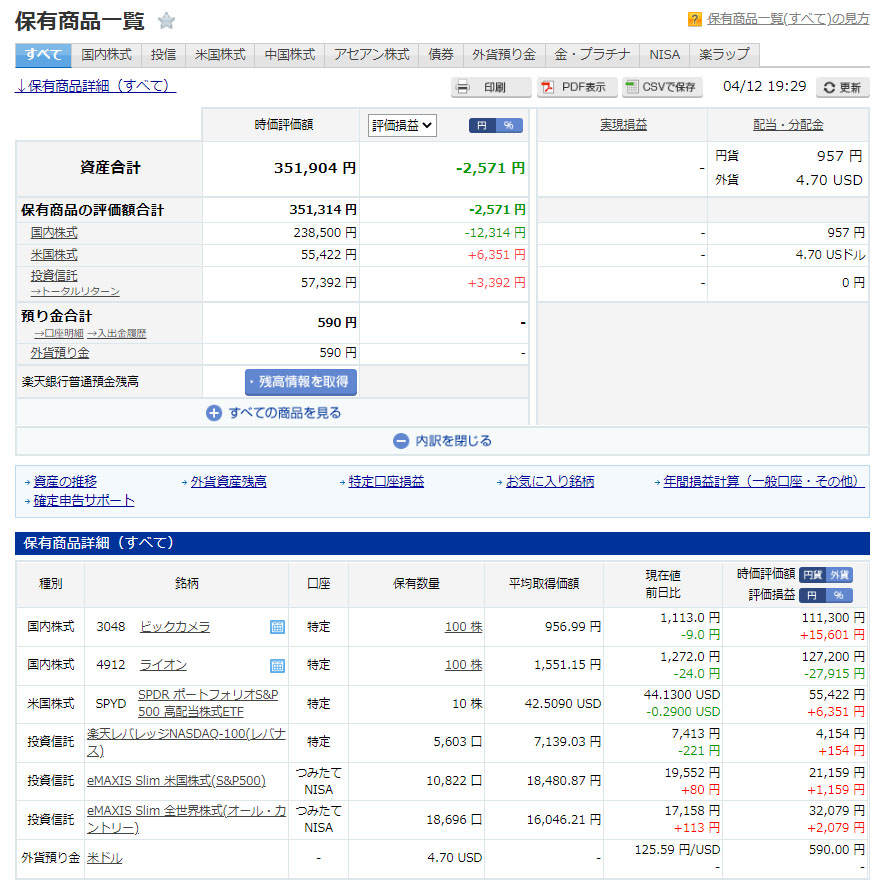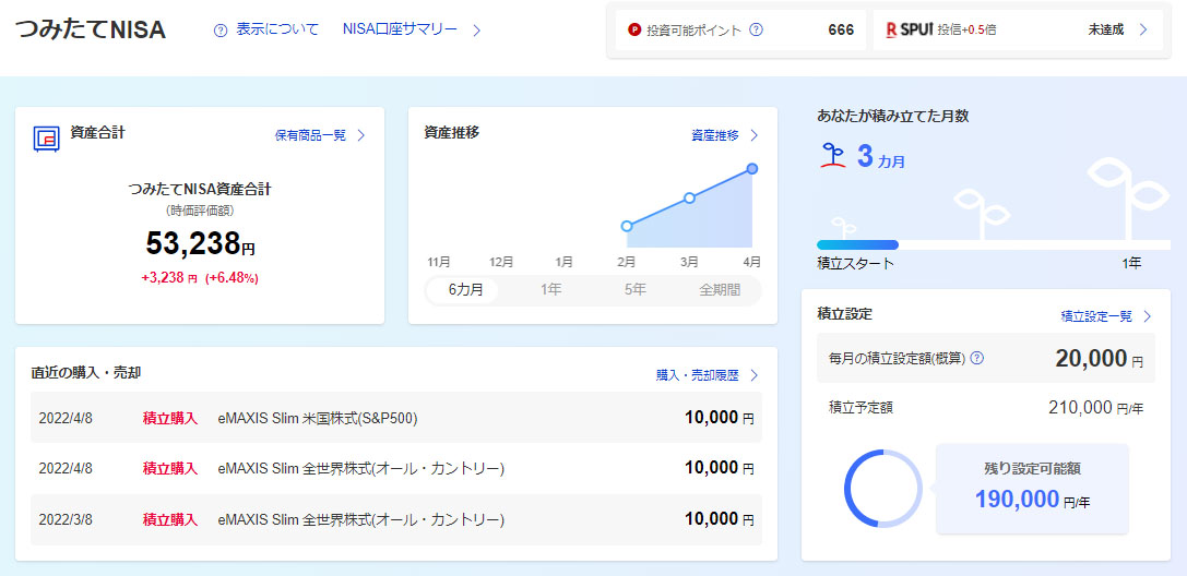 総資産は+27,881円で351,904円になりました。追加増資分は21,000円ですべて「つみたてNISA」です。