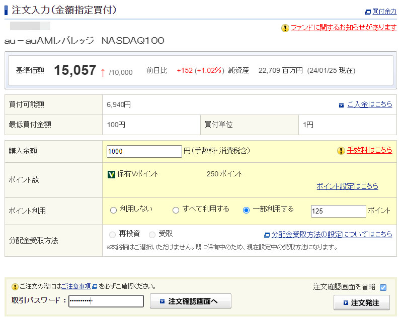 それは置いといて・・・半分の125ポイントを使います。「auAMレバレッジNASDAQ100」はNISAでは買えないので特定口座です。