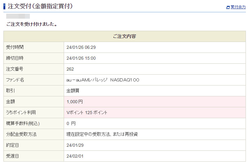昨日に引き続きVポイントが入りましたので「auAMレバレッジNASDAQ100」へ1,000円分を追加。