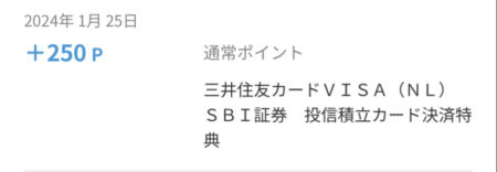 今回はSBI証券の「投信積立カード決済特典」分の250ポイント分です。