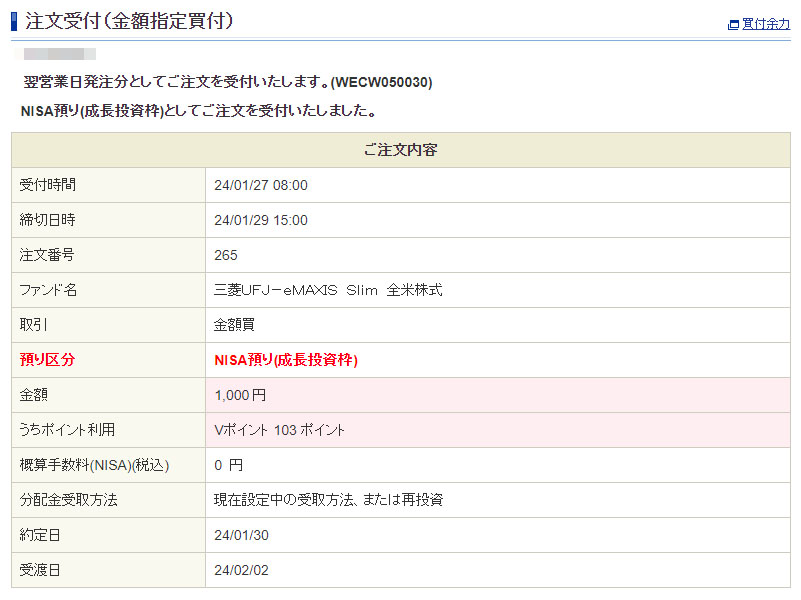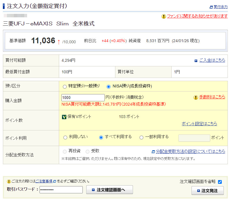 約半分の103ポイントを使って1,000円分「eMAXIS Slim 全米株式」へ投入!