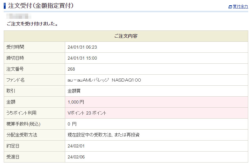 Vポイントが入ったのでauAMレバレッジNASDAQ100を1,000円分追加|2024.1.31 Vポイントが入ったので「auAMレバレッジNASDAQ100」へ1,000円分を入金します。 今回入ったのは「三井住友カードVISA(NL)VポイントUPプログラム特典/クレジット」分の46ポイントです。相変わらず何のポイントかは?理解していませんwww ・・・ですが入ってくるポイントはありがたく使わせていただきます! おそらく今月最後のVポイントの付加。半分の32ポイントを「auAMレバレッジNASDAQ100」に利用します。 約定は2月1日です。