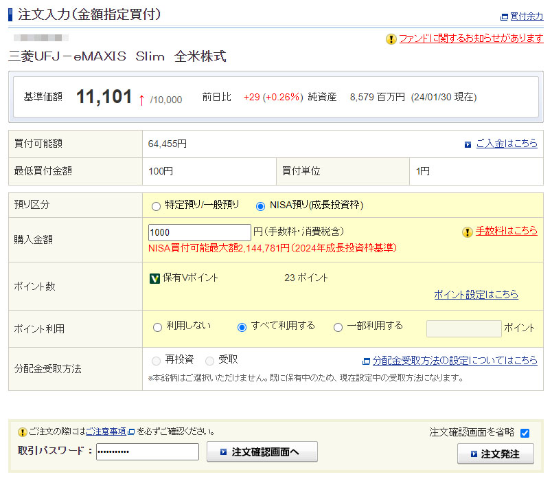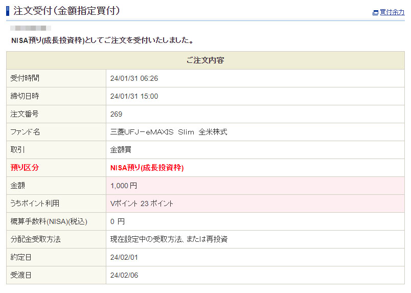 Vポイントが入ったのでeMAXIS Slim 全米株式を1,000円分追加|2024.1.31 残り半分は「eMAXIS Slim 全米株式」へやはり1,000円分! こちらはNISAの成長投資枠での運用となります。 口座からの持ち出しは977円で約定は明日の2月1日。 米国も日本に負けず上昇相場。良いんだか悪いんだか・・・まぁ “ドルコストなんちゃら” だと思ってwww