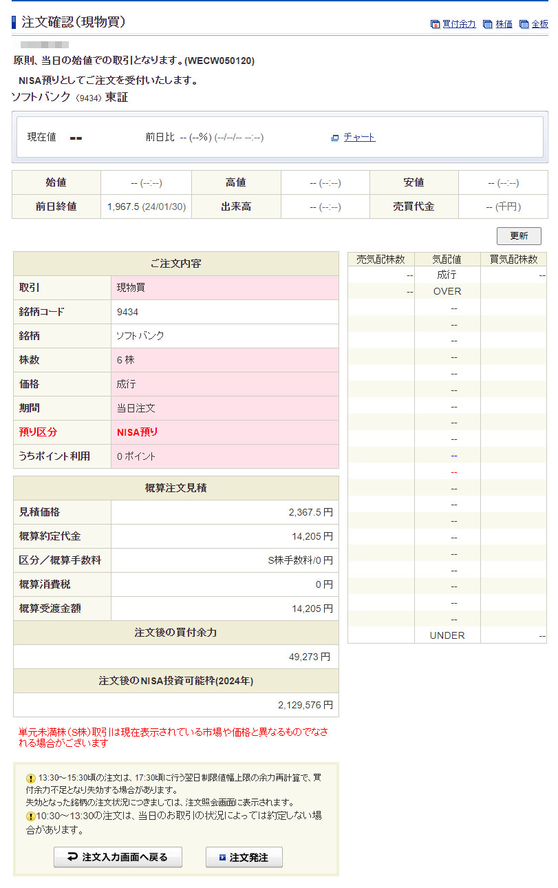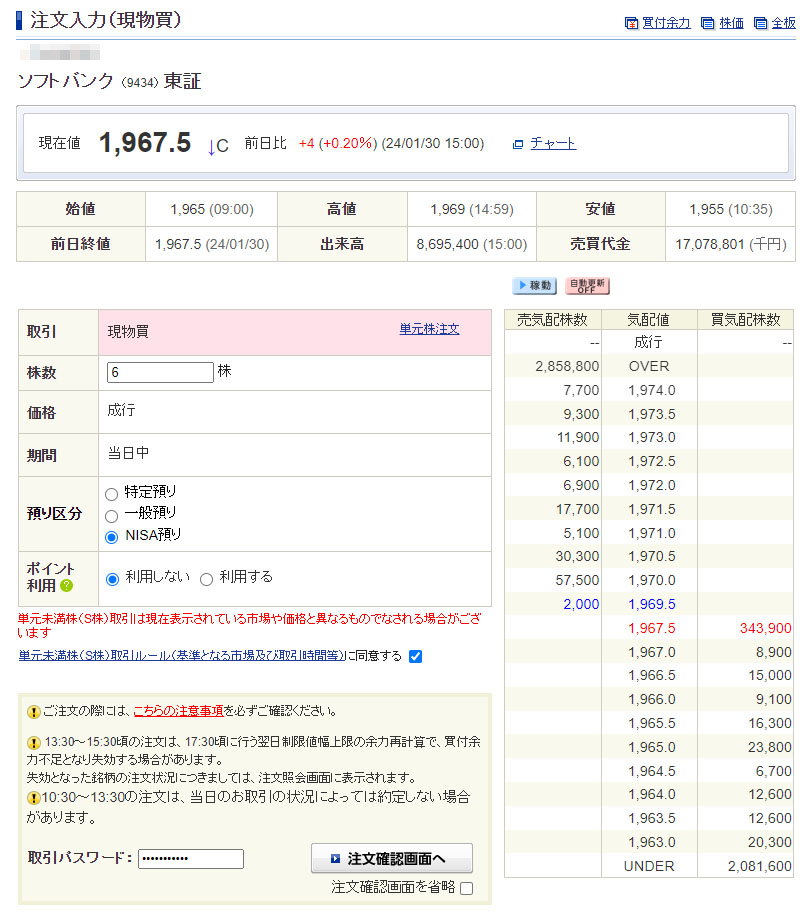 切り良く10株になるように6株で注文!昨日の終値は1,967.5円でここ3日ほど下げています。