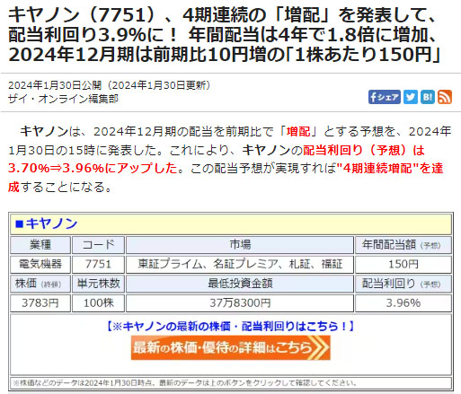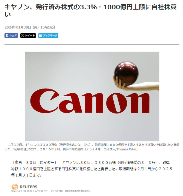 1月30日の決算で増配と自社株買いの発表があり翌日は株価が跳ね上がった「キヤノン」