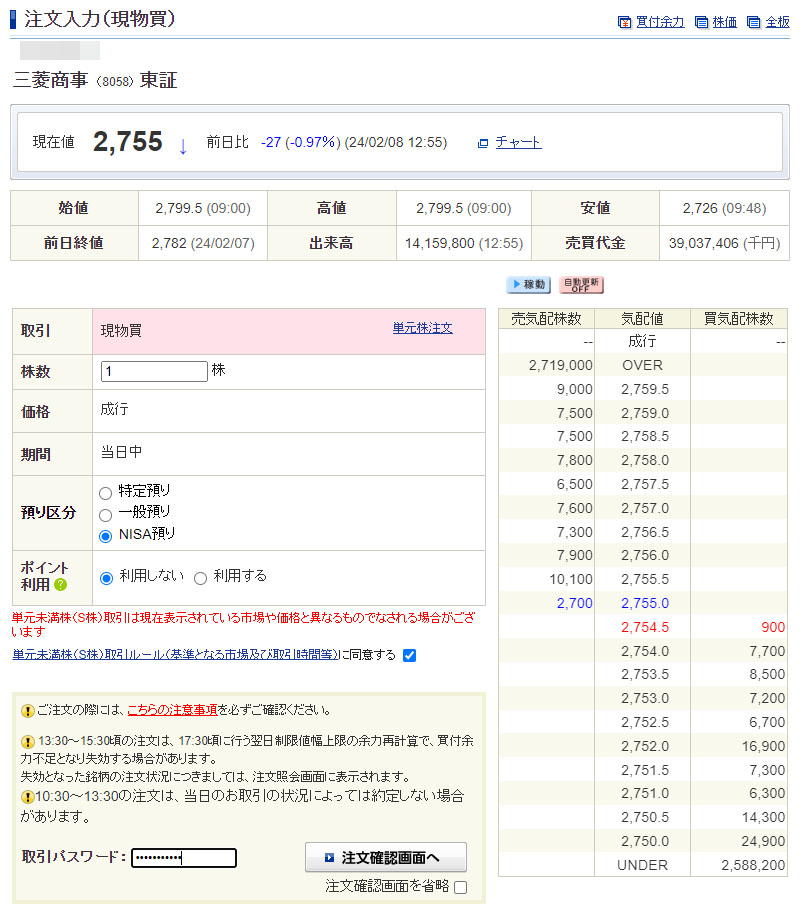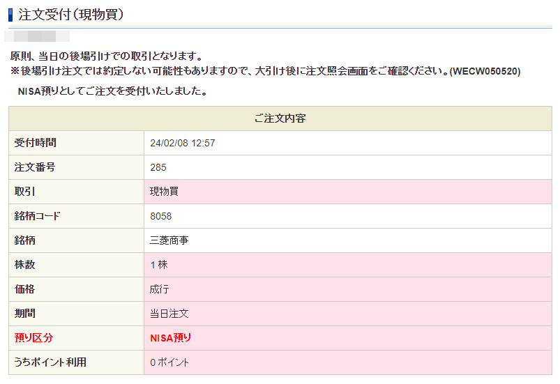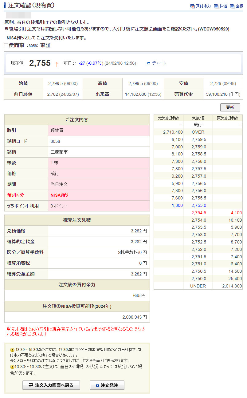 三菱商事(8058)を1株追加|2024.2.8 ② 午前に買付した注文が後場寄り向きで約定し、買付余力が回復しましたので加えて1株買い注文を入れました。株価は見ていませんでした・・・笑 昨日、終値ベースでは下げていますが朝よりは上げてますね。 やはりNISAの成長投資枠です。 =================== 後場引けで約定!朝よりは少しだけ安く買えました。 これで4株保有となり平均取得単価は2,523円になりました。 三菱商事も大きく下げたらもちろん買いたいですがなかなか下がりませんし・・・なにか〇〇〇ショックでも起きない限り上げ続けそうですね。 金額はともかく今日2株買っておいて良かったと思います。