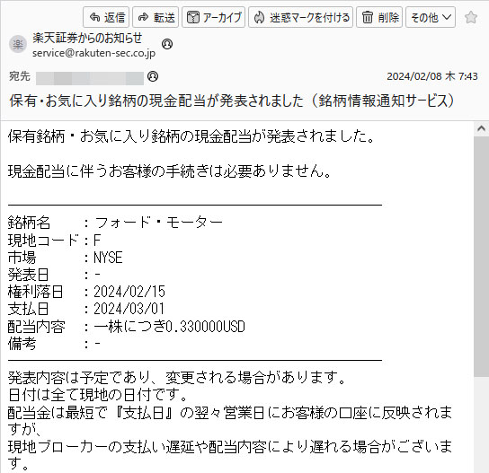 フォード・モーター(F)配当予告 2024.3 楽天証券からフォードの3月配当の案内メールが届きました。 2024年2月8日 7:48 昨日の早朝のメール ・・・そして 2024年2月9日 7:34 今日のメール。。。 確かに “発表内容は予定であり、変更される場合があります” とはありますが1日で約1/2に・・・。なんなのコレwww