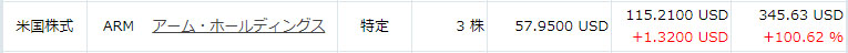 ARM ダブルバガー達成 今日も続伸してダブルバガーになりました! $57.9 投資して終値での評価格が$115.21 こんな事ならもう少し買っとけば良かった・・・誰しもが思う事w 半導体関連は日米ともARMしか持っていませんが破壊力ありますね~ 下がる時も破壊的ですがwww